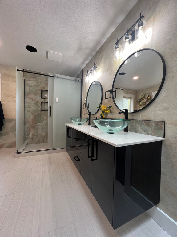 Master bathroom remodel featuring Aura Green Marble with textured vein floor tile and Salt Flats wallpaper.